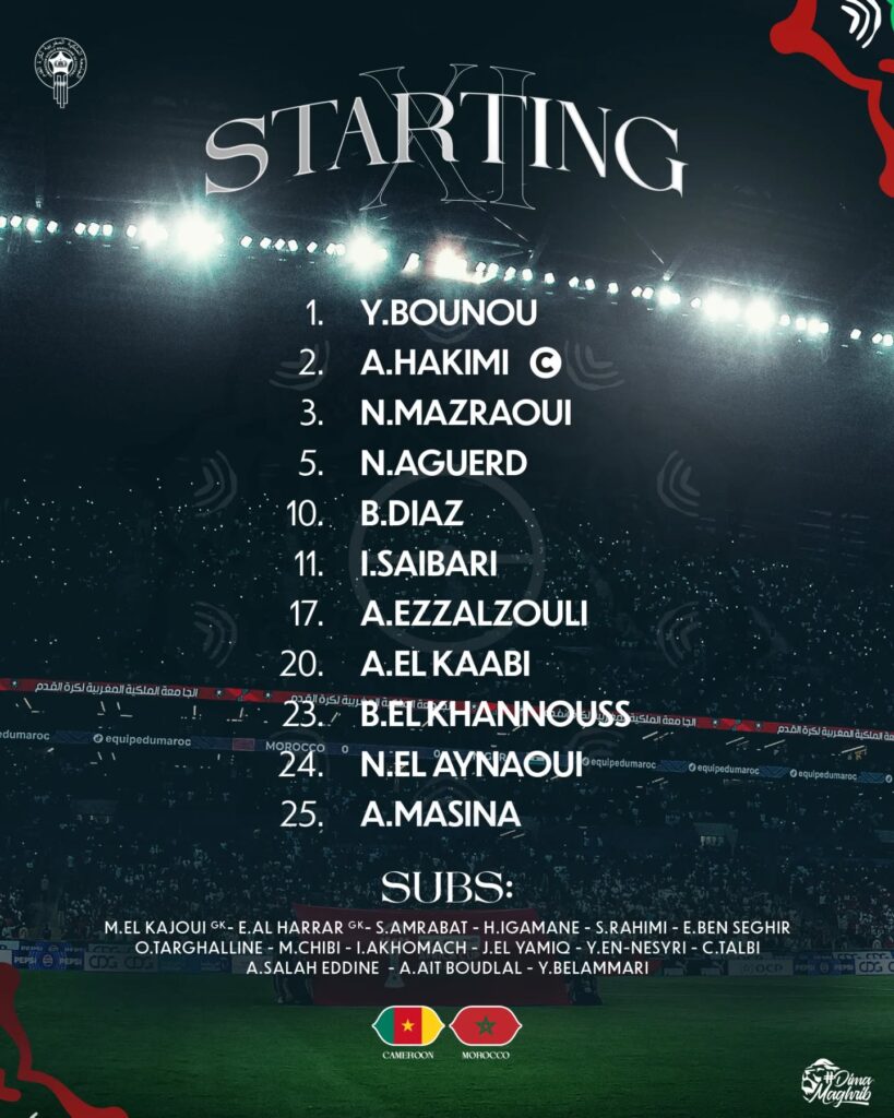 أعلن الناخب الوطني، وليد الركراكي، مدرب المنتخب الوطني المغربي الأول لكرة القدم، عن التشكيلة الرسمية لأسود الأطلس التي ستخوض المباراة الهامة أمام منتخب الكاميرون، مساء الجمعة 09 يناير 2026، بملعب الأمير مولاي عبد الله بالرباط، برسم ربع نهائي كأس إفريقيا للأمم في نسختها الـ 35، التي تحتضنها ملاعب المملكة في الفترة الممتدة ما بين 21 دجنبر 2025، و18 يناير 2026.