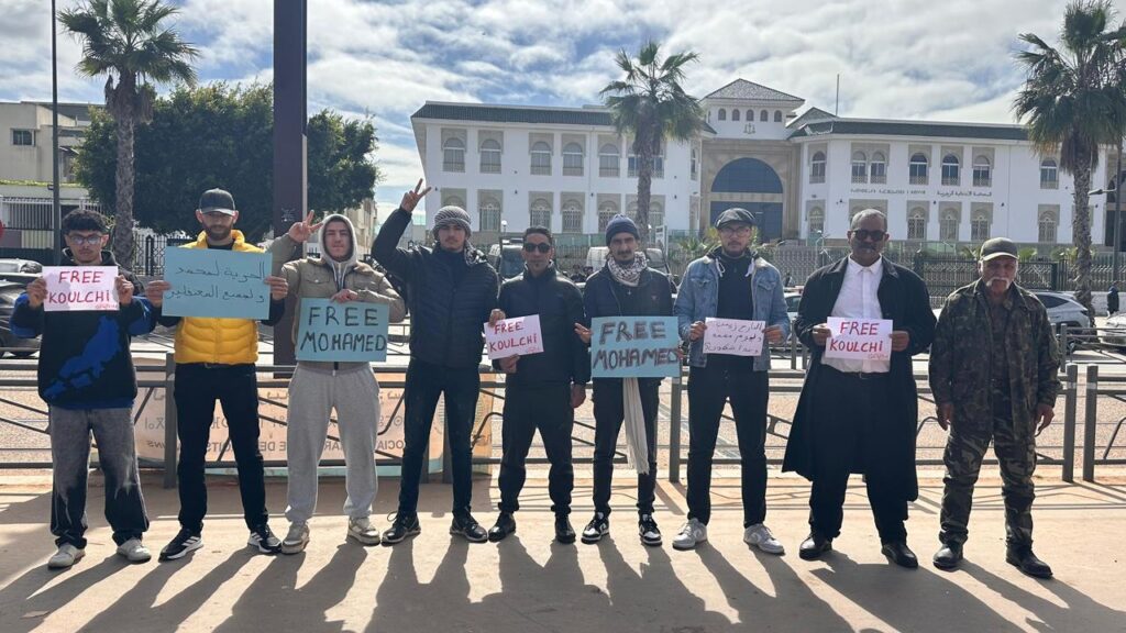 ورفع الحاضرون لافتات باللغة الإنجليزية تحمل عبارات “FREE MOHAMED” و”FREE KOULCHI”، وأخرى باللغة العربية تتضمن “الحرية لمحمد ولجميع المعتقلين”، مطالبين بإطلاق سراح خليف ورفاقه من معتقلي “جيل Z”.