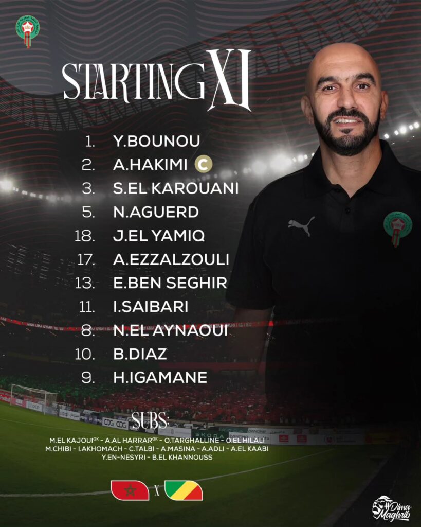 أعلن الناخب الوطني، وليد الركراكي، مدرب المنتخب الوطني المغربي الأول لكرة القدم، عن التشكيلة الرسمية التي ستخوض المباراة أمام منتخب الكونغو، مساء الثلاثاء 14 أكتوبر 2025، على أرضية ملعب الأمير مولاي عبد الله بالرباط، برسم الجولة الأخيرة للمجموعة الخامسة، من التصفيات الإفريقية المؤهلة لنهائيات كأس العالم 2026.
